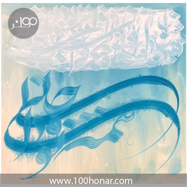 رنگهای آبی و سپید، استعارهای از آسمان و بیکرانگی هستند؛ بیانی از پاکی، بیوزنی و سرسپردگی. این تابلو دعوتی است برای تجربهی حضور در جهانی که در آن «کلمه»، «رنگ» و «احساس» در هم میآمیزند و به یک کل یگانه بدل میشوند.