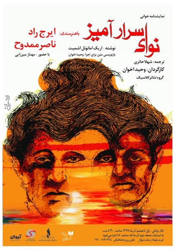 نویسنده:اریک امانوئل اشمیت مترجم:شهلا حایری کارگردان:وحید اخوان بازیگران:ایرج راد، ناصر ممدوح، با حضور مهناز میرزایی