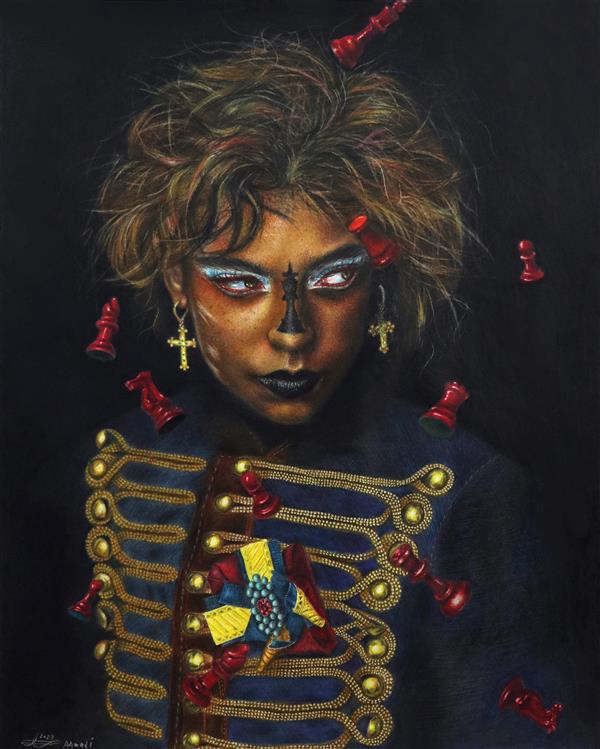 زنی با لباس رزم ، چهره ای مصمم و خشمگین